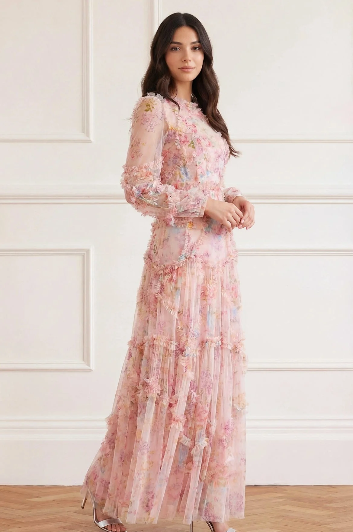- Floral printed tulle decorated with printed tulle frills across bodice, skirt and sleeves