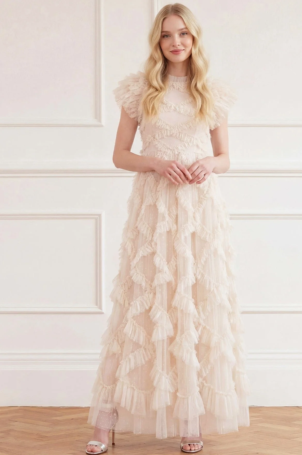 The Genevieve Rose Gown in Champagne. This statement gown is inspired by 1930s Hollywood glamour. Beautifully designed with diamond tulle details and trims. Crafted with multiple layers of ruffled, frothy tulle sculpted for dramatic effect. Make the ultimate style statement this season.
