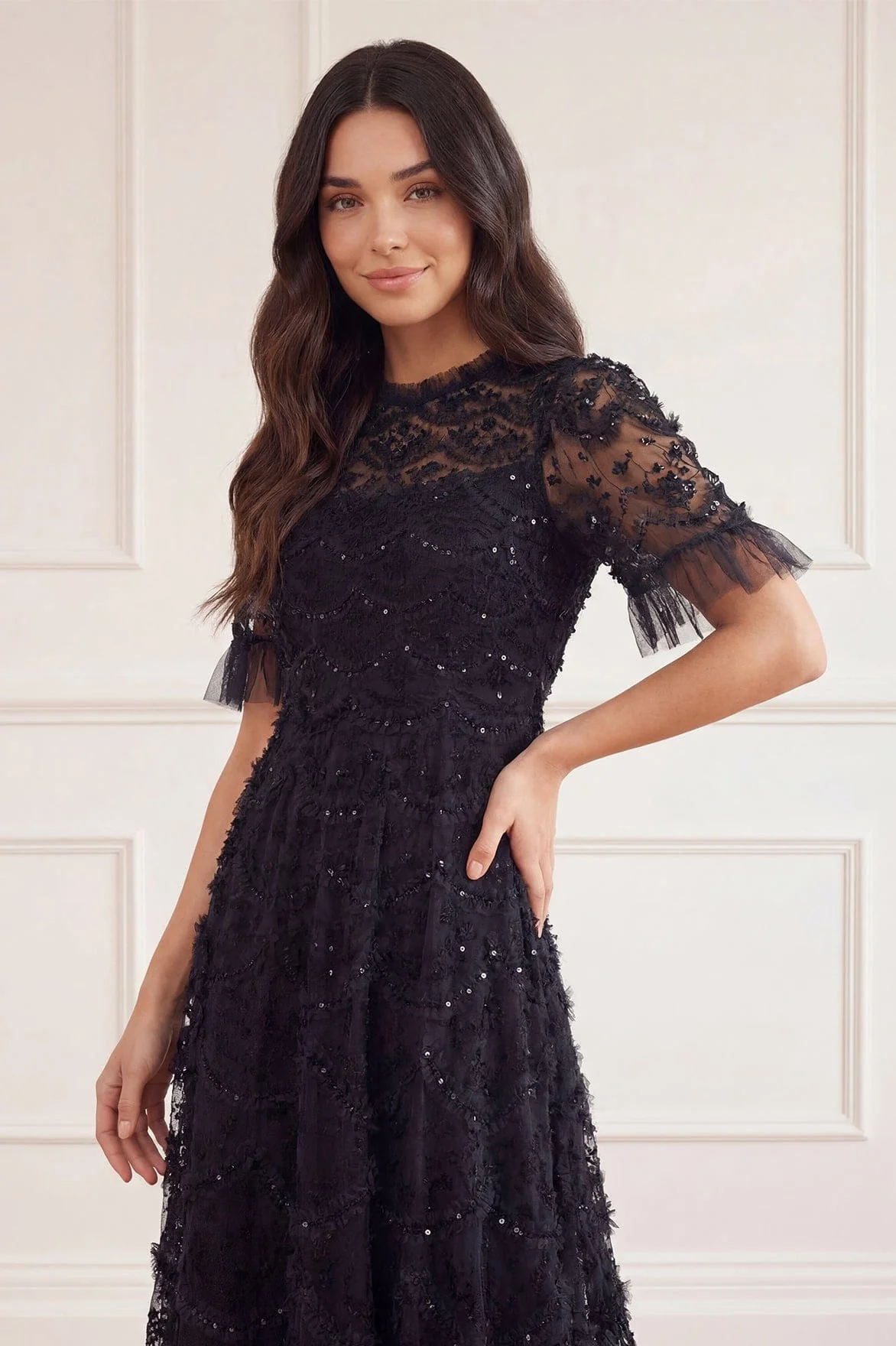 The Lily Bloom Ankle Gown in Graphite. This ankle gown is beautifully designed with delicate tulle ruffles and soft scallop shaping for signature Needle & Thread styling. Adorned with intricate white floral embroidery and trimmed with a high shine sequin adding shimmer throughout. Make the Lily your new wardrobe addition.