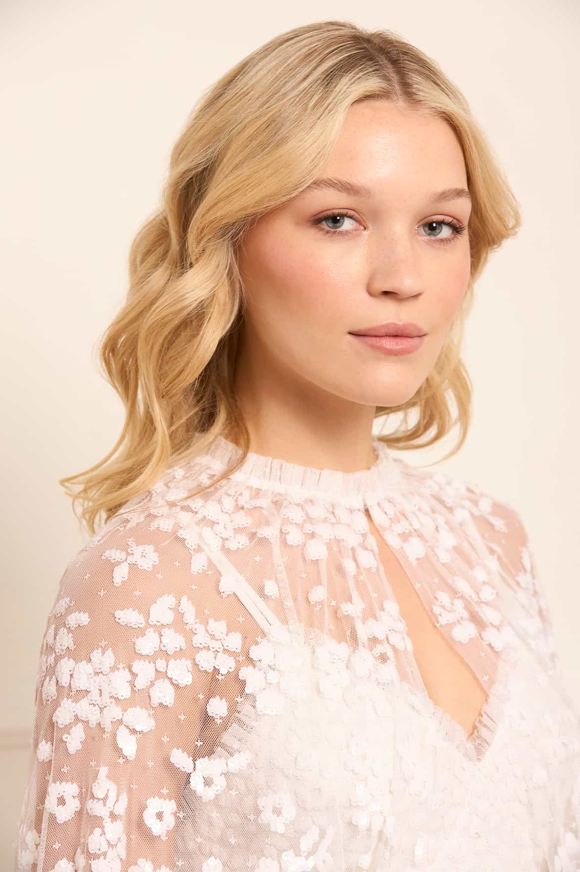 NEEDLE & THREAD EXCLUSIVE. The Maeva Midaxi Cape in Swan White reintroduces a signature Needle & Thread style with high-shine, glossy sequins for a lustrous finish. Developed with floral sequin motifs embellish the bodice and sleeves, while trailing floral borders gently fade towards the hem. Designed to layer perfectly with the Maeva Cami Ankle Gown, the cape features a frilled neckline and a hook-and-eye fastening, adding the perfect finishing touch.